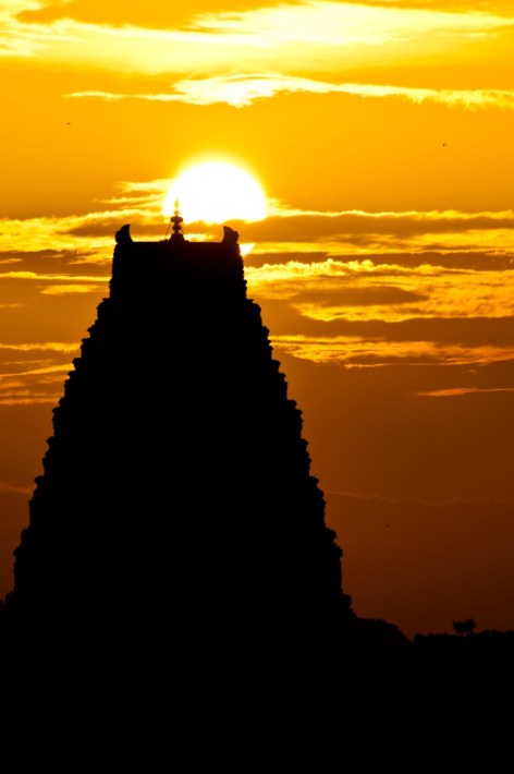 The Virupaksha Temple gopuram cradling the sun during sunset.